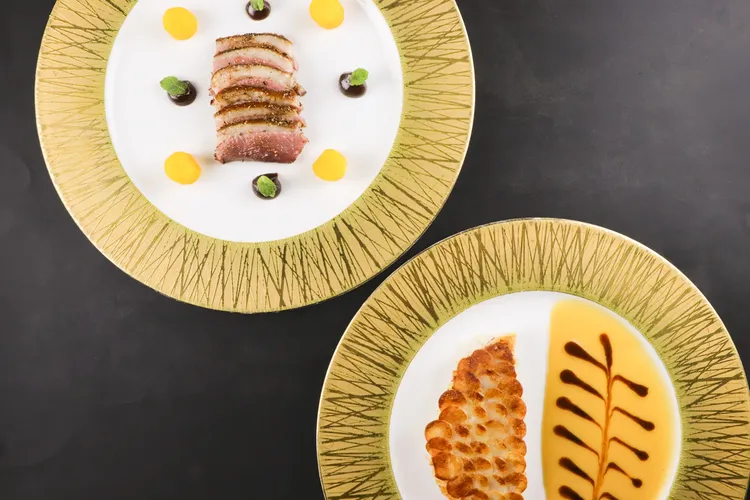「阿彼修斯胭脂鸭衬番红花苹果、突尼西亚椰枣」是米其林三星名厨艾伦·桑德朗(Alain Senderens)复刻古罗马大厨阿彼修斯(Apicius)食谱,以其繁复的处理工序闻名。当时,会以蜂蜜与香料涂抹肉品,以延长保存。直到二十世纪,这套香料组合与低温火候的制作方式才逐渐被整理收录,并于法兰西大区广为流传,成为经典的熟成风味鸭料理。