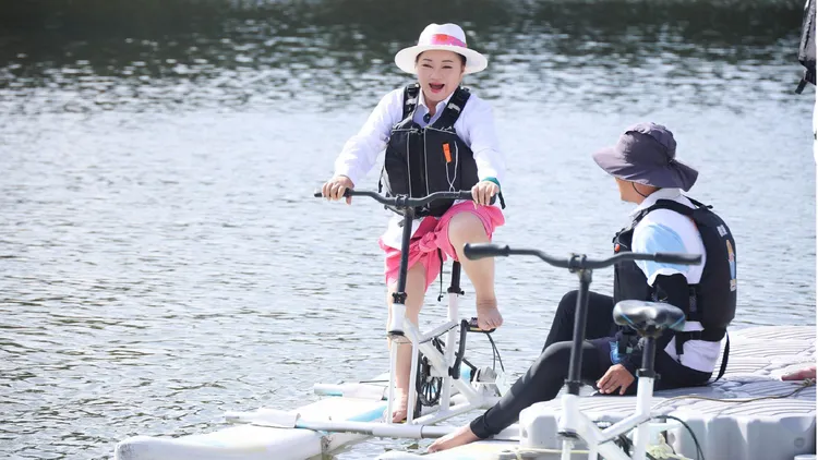 白冰冰带著子弟兵和演员蔡圣伟及曾玉叶、林龙诚夫妇等一班好友游苗栗,第一站是苗栗一日游必去的景点,目前正在试营运的明德水库水陆空游憩区,白冰冰一行人首先搭游湖船开启山水之旅,这也是电影《鲁冰花》的取景地,登上海棠岛后,喝著擂茶,欣赏客家擂茶舞蹈,别有一番风味。喜欢刺激的朋友也可以体验高空滑索和高空自行车。另外也有水上活动,她玩了水上自行车,还跟大伙连成一线比爱心拍照,她上岸后直呼:「好好玩。」
