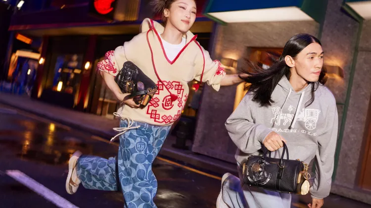 此外,COACH经典「马车标志」也迎来中式细节翻玩,除了注入CLOT代表性红色调,细看之下会发现,马车窗户转化为中式窗花,驾车的马夫不仅换上中式古装,手中马鞭更俏皮化作中式灯笼,细腻巧思令人会心一笑。人气手袋如Tabby、Brooklyn,也同步换上联名印花、刷旧Logo,并装饰特别设计的马车吊牌,在保有经典轮廓的同时,展现鲜明潮流辨识度。