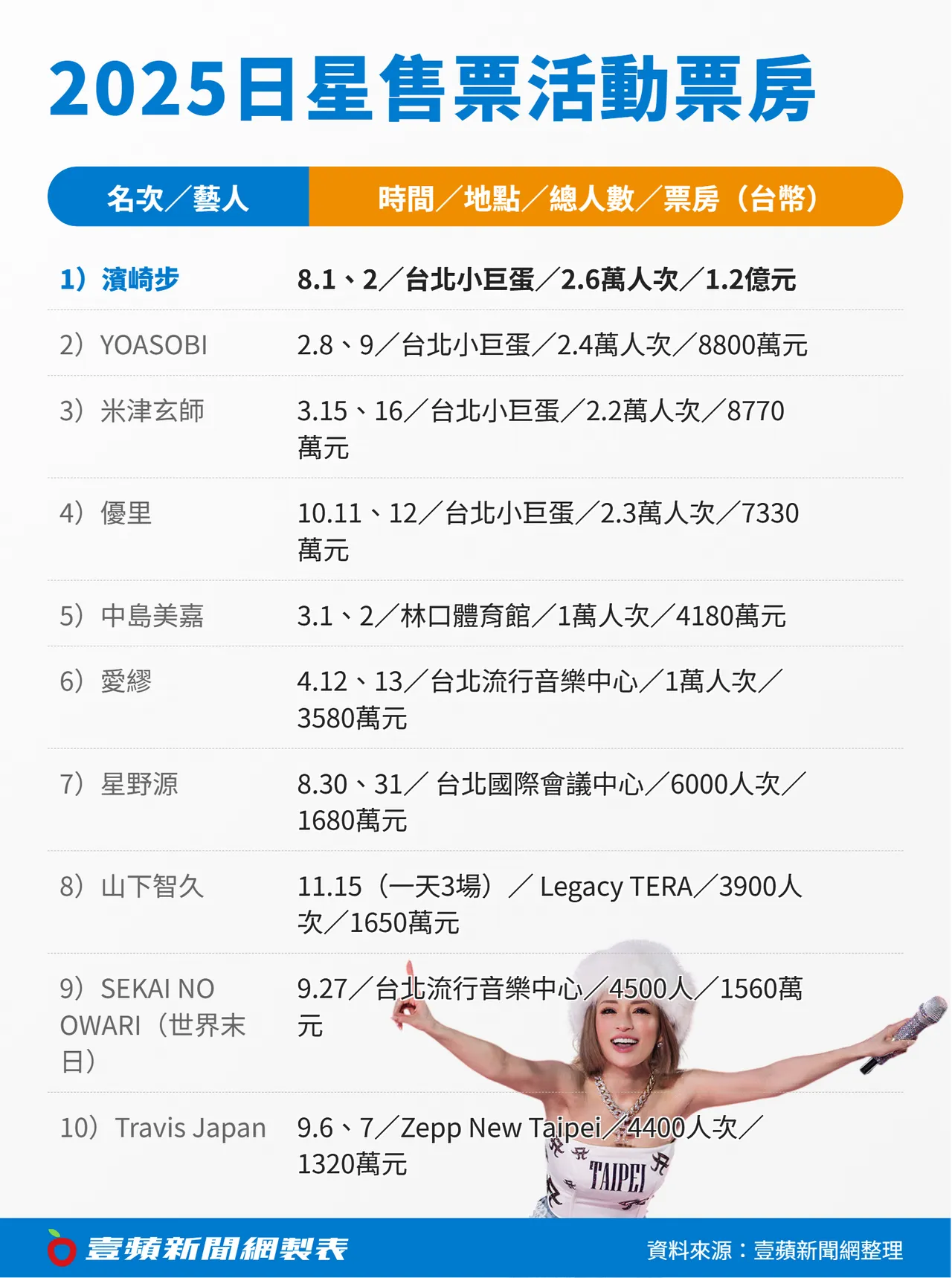 第5名是时隔6年来台开唱的歌姬中岛美嘉,3月在林口体育馆连唱2天,引来1万人次朝圣,入袋4180万元。她不只连换7套舞台装,更戴上浮夸红色假睫毛,当时唱完《曾经我也想过一了百了》,忍不住流下眼泪,以嘴型「谢谢」致谢,安可光脚上台演出,展现率性的一面。她11月再度访台,开箱Billboard Live TAIPEI新场地,连续表演4场,演出前吃卤肉饭备战,同时预告2026年5月16、17日在台北流行音乐中心开个唱。
