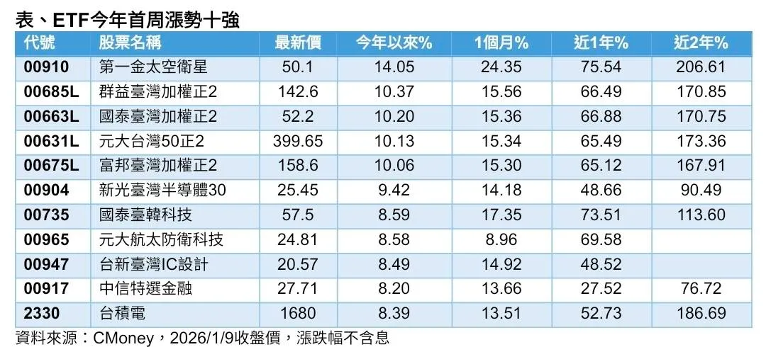 全台唯一聚焦中型太空卫星的第一金太空卫星ETF(00910)开年一周累计上涨14.05%,9日盘中冲上50.20元、收50.10元,发行以来首度站上50元大关,涨势更超越台积电与多档杠杆型ETF,显示太空卫星产业已正式迈入「营收兑现元年」。
