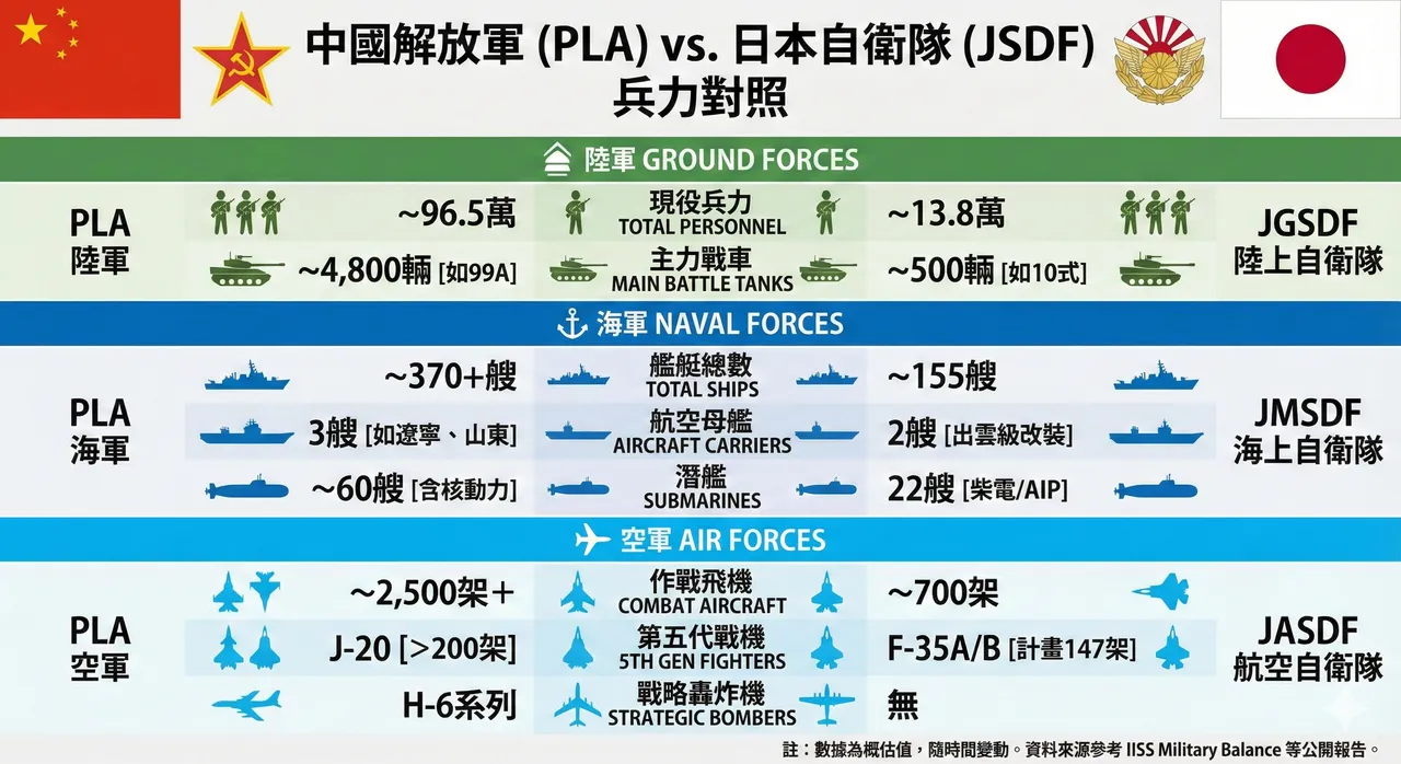 根据公开资料,中国解放军超过200万人,日本自卫队约28.6万人。中国解放军从陆军、海军到空军,明显占有数量上的优势,