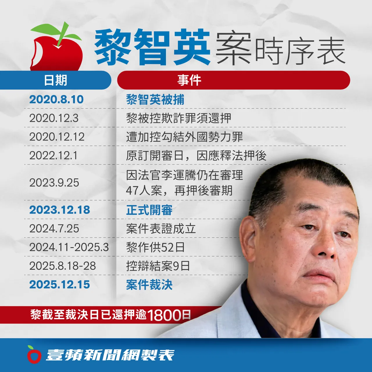 --2025年12月15日:法官裁定黎智英2项「串谋勾结外国或者境外势力危害国家安全」罪、及1项「串谋刊印、发布、邀约发售、分发、展示及或复制煽动刊物」罪全部成立,待黎智英明年1月前提交求情信后,再作判刑。
