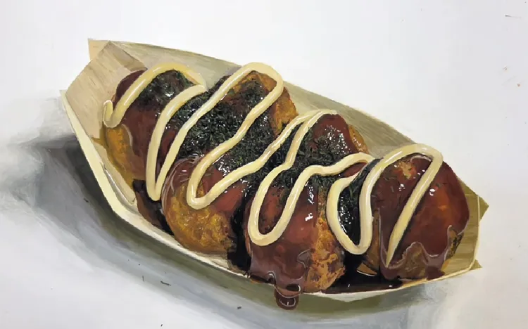 该作品出自日本厨师兼写实派画家「山田 めしが」。因为同时具备料理师与写实画师的身分,擅长以多层颜料堆叠的方式,创作出极度逼真的食物绘画。山田表示,这次是在一张纸上反复上色,完整「画出章鱼烧受热、翻滚、成形的过程」,再转印到第二张纸并进行版画处理,呈现宛如实际料理的动态效果。