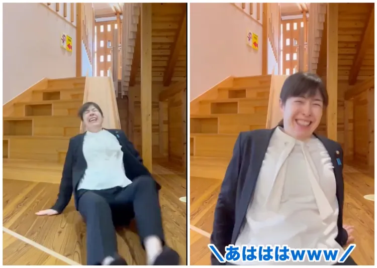 她发文介绍,这座图书馆大量使用西粟仓村的木材,是一座让人感觉很舒服的图书馆,并称这里有一座大人也能玩的溜滑梯,备注「体重有点份量的人滑起来会变成这样,还请特别小心」,以及「以前吃过苦头而试图抵抗,却还是被说服的小野田」,发出实际体验影片。