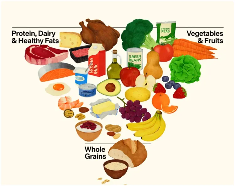 甘迺迪表示:「我的讯息很清楚:吃真正的食物。」新版指南正文仅数页,取代 2020 年近150 页的长篇版本,但仍搭配大量研究作为补充。指南以「倒金字塔」呈现饮食结构,将肉类、乳制品与蔬菜置于核心位置,并不再使用「我的餐盘」视觉。