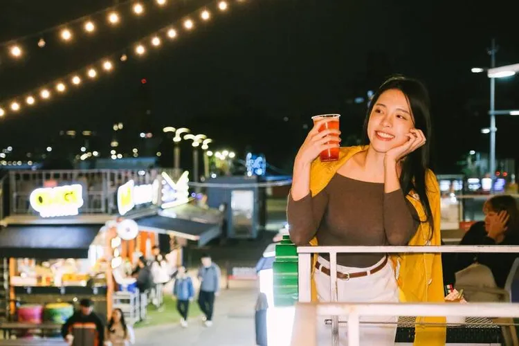 大稻埕码头货柜市集呈现出城市夜晚,旅客拉远镜头时,将货柜灯光、河岸夜色与人流一并收进,呈现大稻埕夜晚的城市节奏。