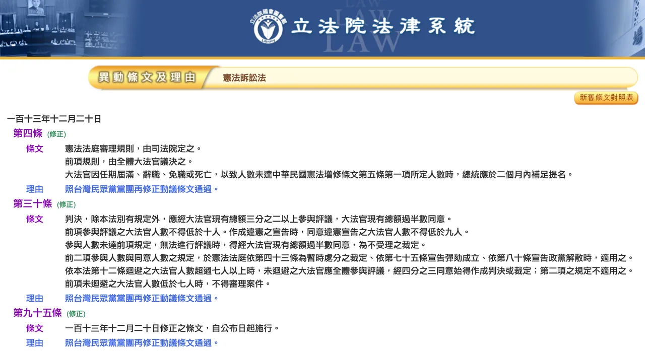宪法法庭今午3点宣判,今年1月23日修正公布之《宪法诉讼法》第4条第3项规定、第30条第2项规定、第3项规定、第4项规定、第5项规定、第6项规定、第95条规定,于立法程序有明显重大瑕疵,违背宪法正当立法程序,且违反宪法权力分立原则,均抵触宪法,应自本判决公告之日起失其效力。