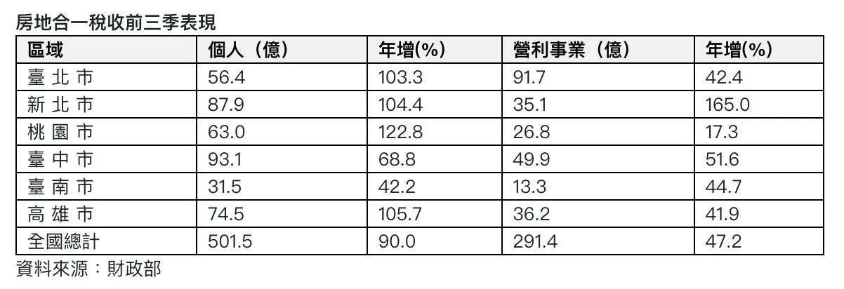 统计显示,今年前三季个人全国房地合一税收501.5亿元,年增9成,营利事业则是一年申报一次,今年房地合一税收291.4亿元,年增47.2%,前三季个人房地合一税收缴税王是台中市,个人房地合一税收93.1亿元,年增68.8%,其次则是新北市87.9亿元,反映台中市房价涨幅比新北市更显著,不过营利事业的房地合一税则是台北市最多,金额高达91.7亿元。