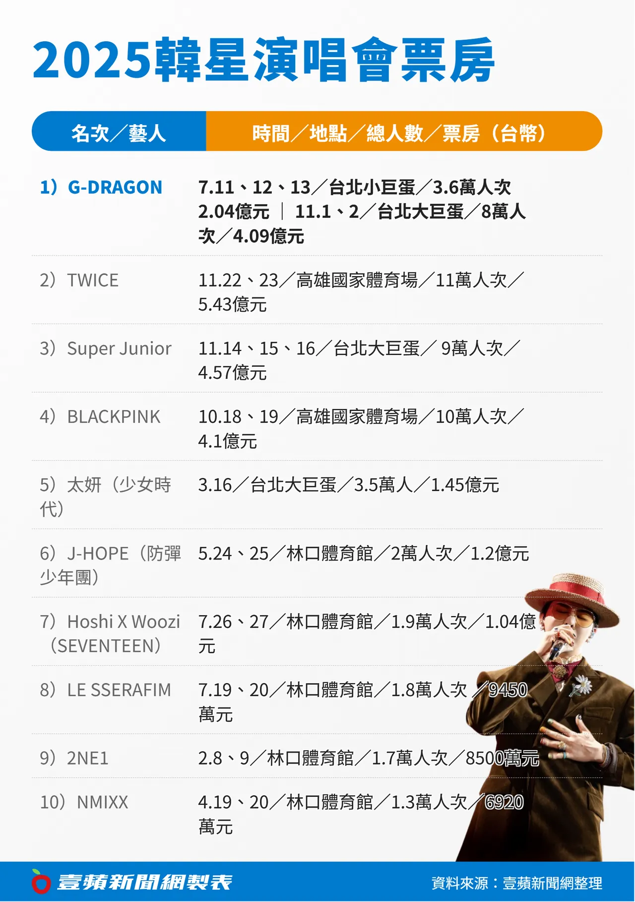 2025下半年男女天团接棒袭台,南世运、北大巨蛋连番上阵较劲。GD睽违8年踏上宝岛开唱,7月先在台北小巨蛋举行3场世巡「Übermensch」,吸引3.6万人次朝圣,进贡2.04亿元。他接著加码安可场,11月以首位韩国男歌手之姿唱进台北大巨蛋,2场涌入近8万人次,写下4.38亿元票房,更是一年来同时征服大小巨蛋的韩星,以累积6.13亿元票房勇夺冠军,天王魅力不减,让人见识到GD的号召力。