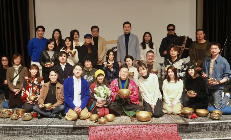 活动开场由金曲奖导演比尔贾与金曲奖音乐制作人张之恺联手敲响萨满鼓,低频节奏瞬间包围全场,随后20多位艺人手持颂钵齐聚舞台,形成震撼声波矩阵。令人惊讶的是,多数艺人其实都是颂钵新手,仅在演出前短短30分钟于后台接受田定丰与朱衍舞的极限特训,便直接上台完成一场高度默契的无彩排演出。