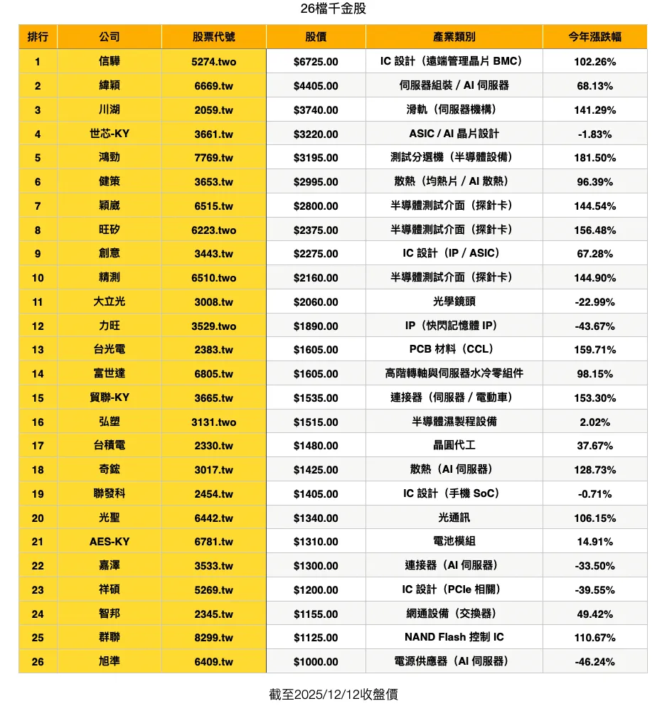 截至12月12日收盘,台股共有26档千金股,今年高峰一度冲上28档,写下台股史上新页。从产业结构可见,千金股版图已由AI伺服器、散热、PCB材料、测试介面与电源模组全面主导,AI需求外溢效应强烈,推动台厂进入前所未有的成长循环。