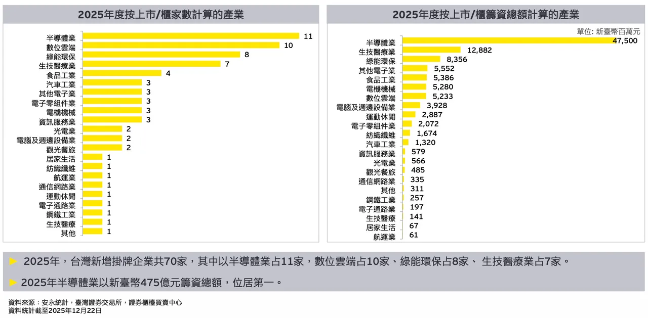 回到台湾市场,截至2025年12月22日,上市市场共有31家挂牌,虽较去年减少4家,但筹资金额达新台币845.45亿元,年增率高达98%。其中,半导体产业的鸿劲以344.69亿元居筹资之冠,占上市筹资额40.77%;生技医疗业的禾荣科筹资108.54亿元,占比12.84%,两者合计逾五成。今年共有4家KY公司上市,合计筹资60.25亿元。